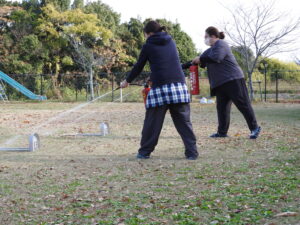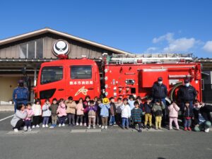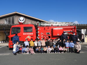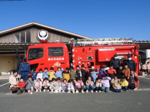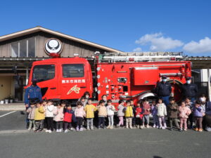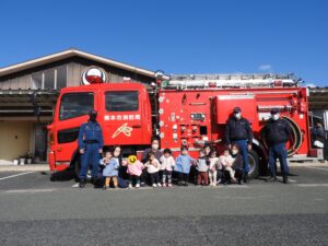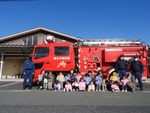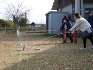 子どもたちが避難訓練した後には、職員が消火器の使い方を練習したり、消防車と記念写真を撮りました。