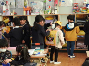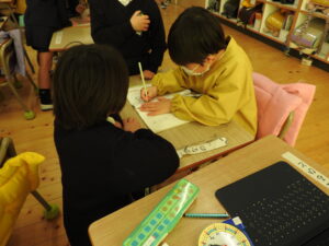 子どもたちは、小学生のお兄さんお姉さんが教えてくれる一つ一つに興味深々の様子でした。小学校入学への期待が一段と高まったようです。